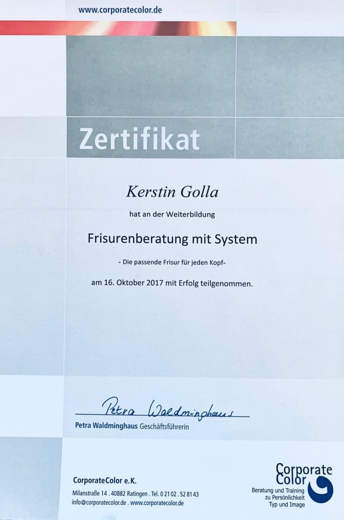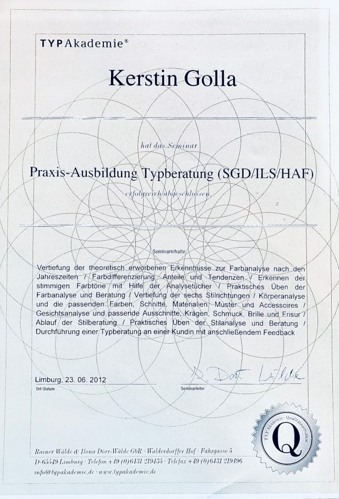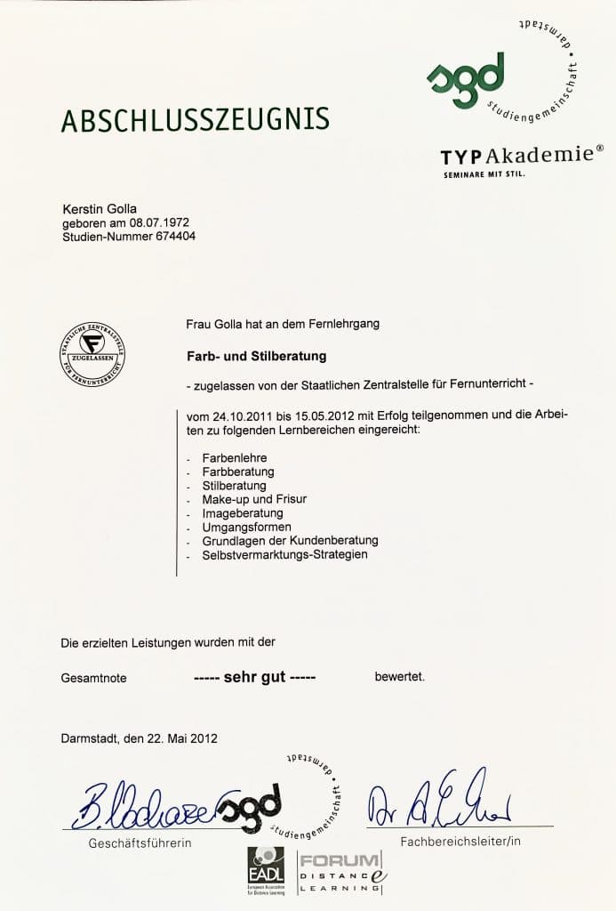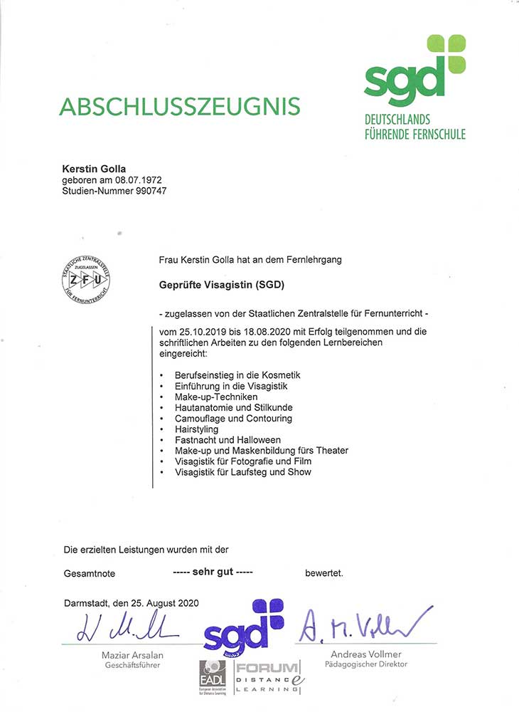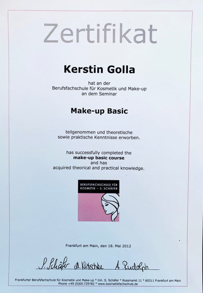 Diese habe ich bei der Typakademie abgeschlossen (Zeugnis und Diplom). Durch zusätzliche Seminare, wie z.B. Make-up Kurse bei der Famous Face Academy, Frankfurt vervollständigt.