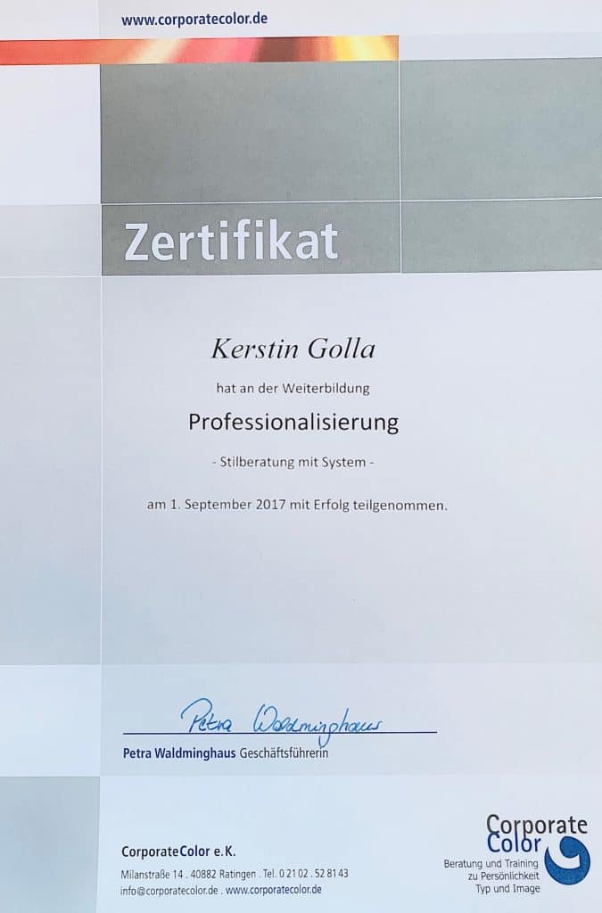 Da ich schon immer gerne mit Mode und Menschen gearbeitet habe, lag es nahe mir einen großen Wunsch zu erfüllen. Eine Ausbildung zur Farb- und Stilberaterin zu absolvieren. so könnte ich meine Leidenschaft zu meinem Beruf machen.